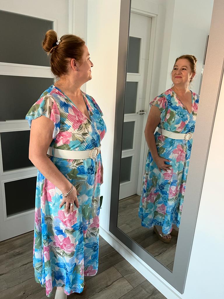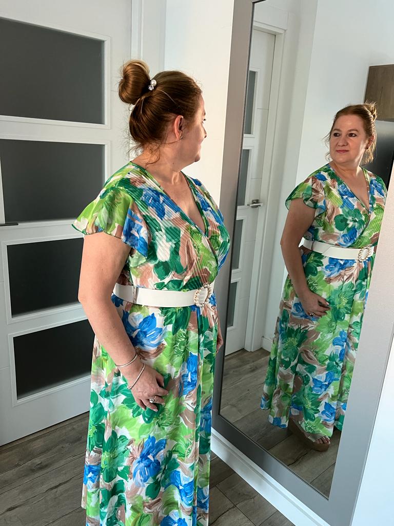 Vestido largo de gasa estampado, cuerpo plisado ,escote en pico cruzado .Talla única (42-50)